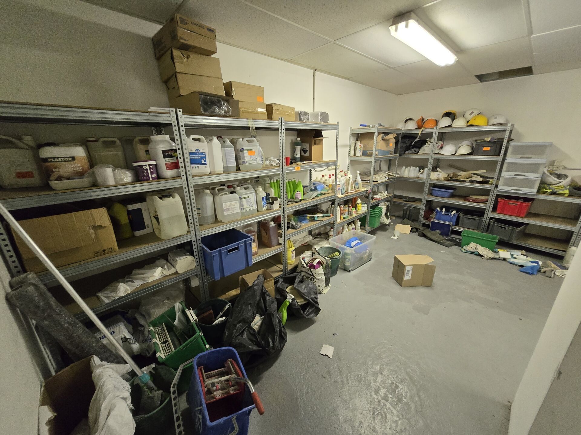 Ensemble d'environ 30 bidons de produits détergents et nettoyant en partie entamés