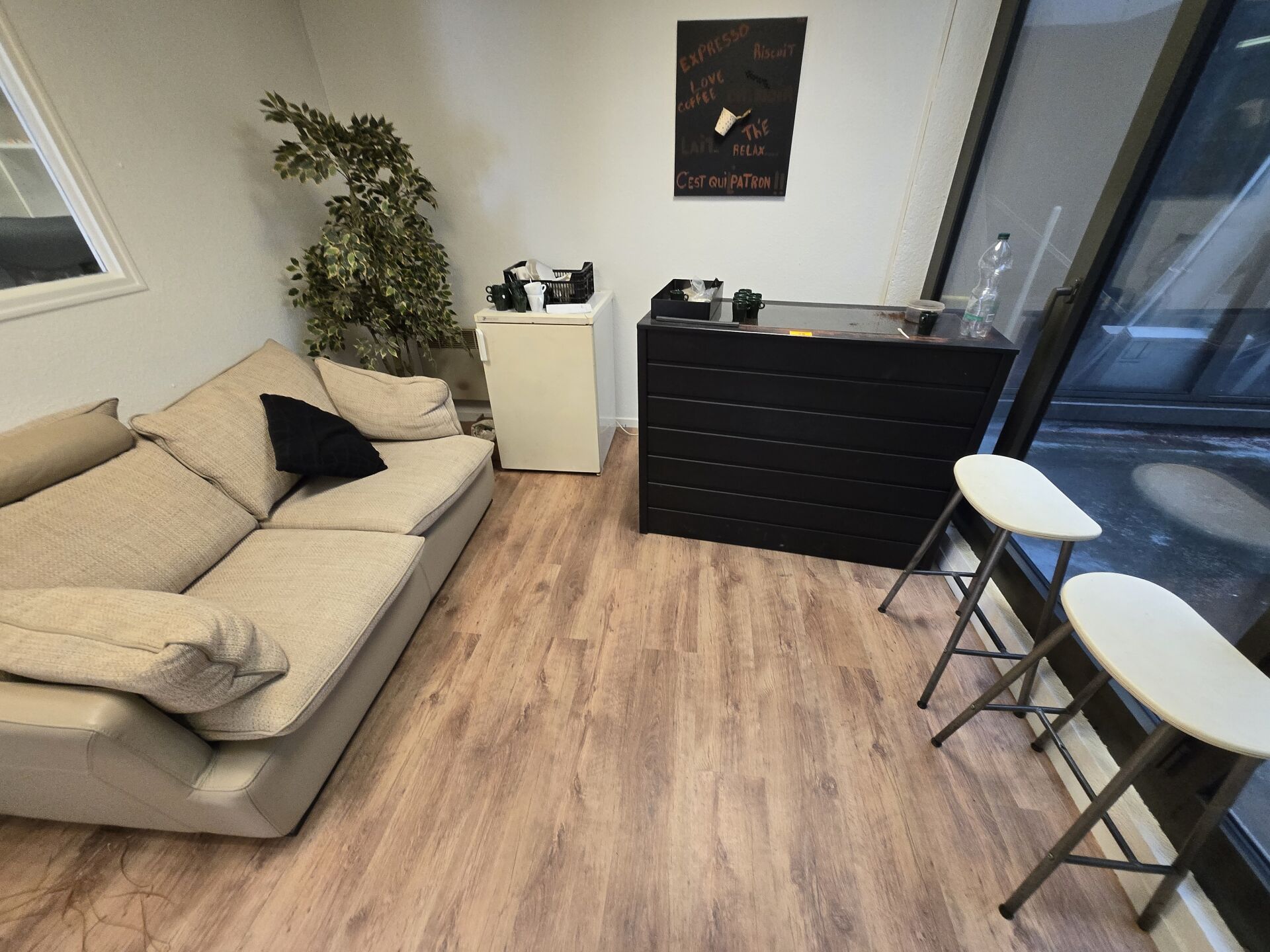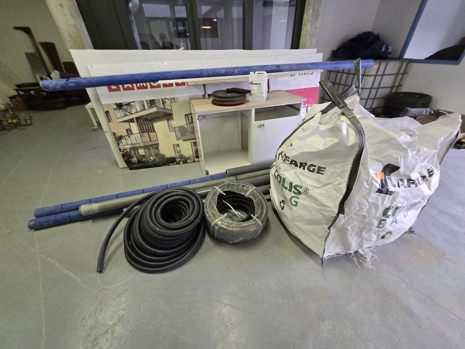 Ensemble comprenant PVC, sac bigbag, fourreaux, gaine ICTA, 2 meubles noirs, Meuble bar en l'état, 2 portes et chutes de bois